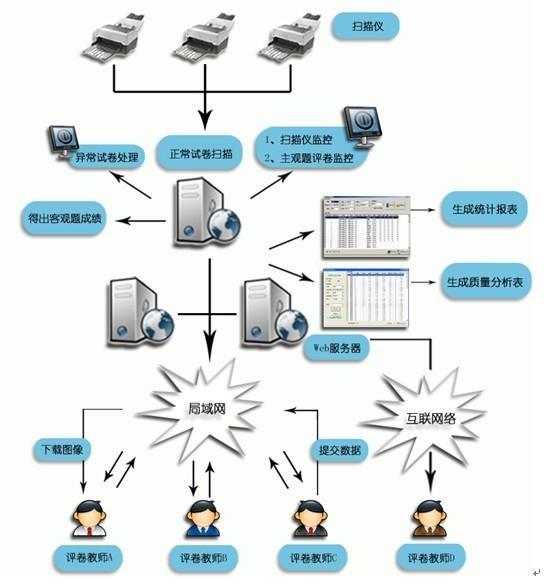 網(wǎng)上閱卷又稱網(wǎng)絡(luò)閱卷、計(jì)算機(jī)閱卷或無(wú)紙化閱卷。它是基于計(jì)算機(jī)網(wǎng)絡(luò)環(huán)境,運(yùn)用圖片掃描、模式識(shí)別、圖像處理等技術(shù)對(duì)考試答題卡進(jìn)行電子化處理的過(guò)程。此閱卷方式將客觀題與主觀題都在一張答題卡上作答,通過(guò)高速文檔掃描儀掃描存儲(chǔ)到計(jì)算機(jī)內(nèi),得到清晰準(zhǔn)確的圖像文件后,客觀題由計(jì)算機(jī)自動(dòng)閱卷,主觀題無(wú)需再翻卷批閱,而是由老師通過(guò)計(jì)算機(jī)進(jìn)行閱卷,閱卷完畢后由計(jì)算機(jī)自動(dòng)匯總分?jǐn)?shù),并可生成幾十種成績(jī)分析統(tǒng)計(jì)報(bào)表。