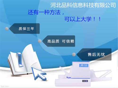 光標閱讀機(optical mark reader縮寫 omr ),它是一種集光、機、電于一體的計算機外設錄入設備。是一種專用計算機輸入設備,它能快速識別信息卡上的涂寫內容,并傳入計算機中處理。它的基本原理是發光器件發出的光照射在信息卡的信息位上,如該信息位被涂黑則部分光被吸收,反射光變弱,否則,反射光變強,由對應的接收管將強弱不同的光信號轉移成電信號,再經a/d轉換、數字濾波、模式識別后完成對信息卡中字符的識別。適用范圍:主要應用于國內大、中、小學標準化考試,教學評估、學籍管理等。 目前品科主要從事考試光標閱讀機、教學觸控一體機、網上閱卷系統和考試答題卡及其相關產品(機讀卡、軟件)的開發生產和銷售。 主要用途品科光標閱讀機,考試閱卷機速度更快,更加穩定,準確率極高,在實際使用中表現出準確效率高的的特點,各省市學校均在使用我們的產品,并且在國內的考試閱卷機品牌大戰中脫穎而出,成為消費者均受好評的產品。 我公司產品均為兩種連接方式:USB口和COM口(串口連接),可滿足各種臺式和筆記本電腦,并且我們產品的軟件均可在Windows 98以上的系統中運行!