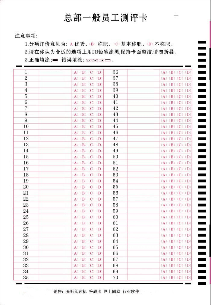 我公司真正符合閱讀機讀卡規范:品科答題卡的式樣,是根據輸入計算機的信息并按照光標閱讀機的設計規范所要求的格式而設計的。
