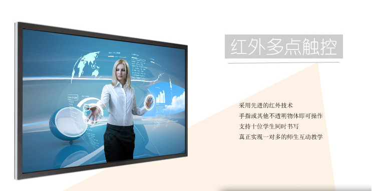 紅外觸摸精準快速(延遲小于5毫秒),紅外多點觸摸技術(shù),免驅(qū)動,無需校準,抗強光干擾,人機互動快速有效,支持手指等任何不透明物體書書寫。